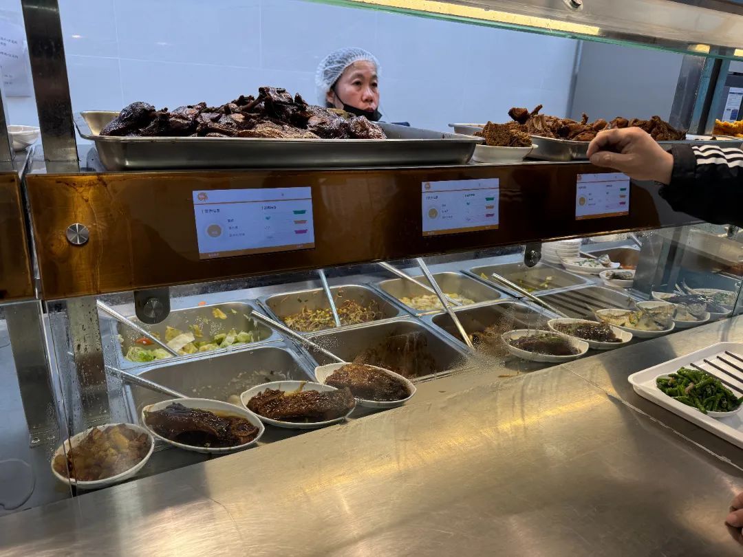 社区食堂环境整洁,菜品丰富多样、价格实惠、荤素搭配合理。居民们有序地排队打饭,选择自己喜欢的菜品。