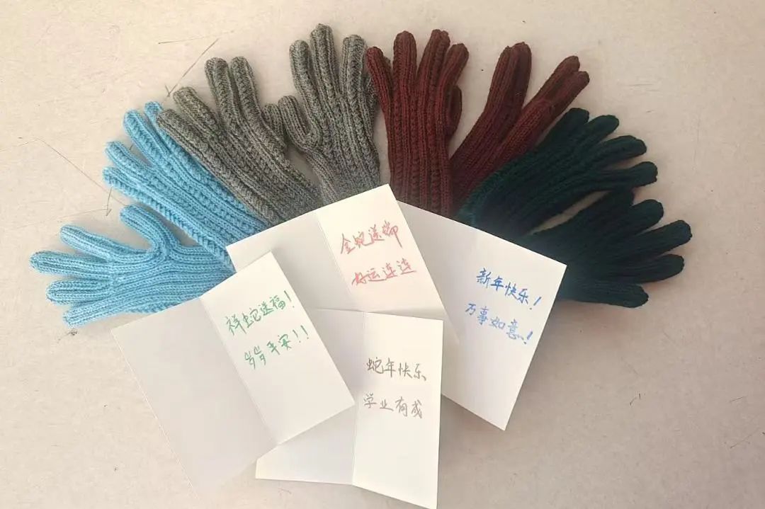 历时一个月,“巧手妈妈”们利用业余时间精心钩织,选用柔软羊绒线织成了50副保暖手套,并附上手写祝福卡。“希望孩子们的手冬天不再生冻疮”“每一针都织着我们的牵挂”……朴素的字句与细腻的编织纹路,凝结了杨浦社区“巧手妈妈”们对云南学子的深切关怀。