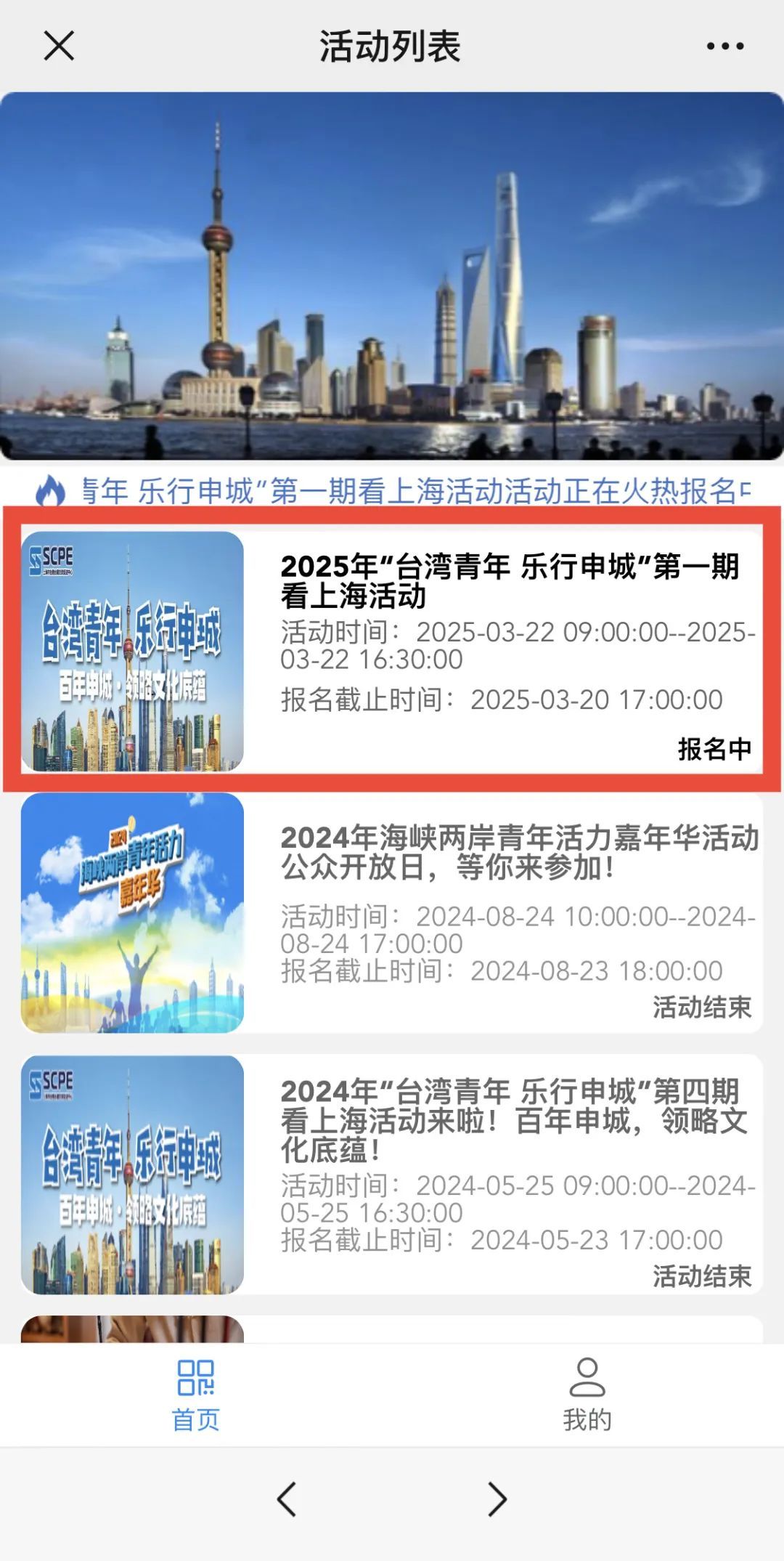 2、从“服务”菜单栏进入“活动报名”页面,选择“2025年‘台湾青年 乐行申城’第一期看上海活动”,提交报名信息。