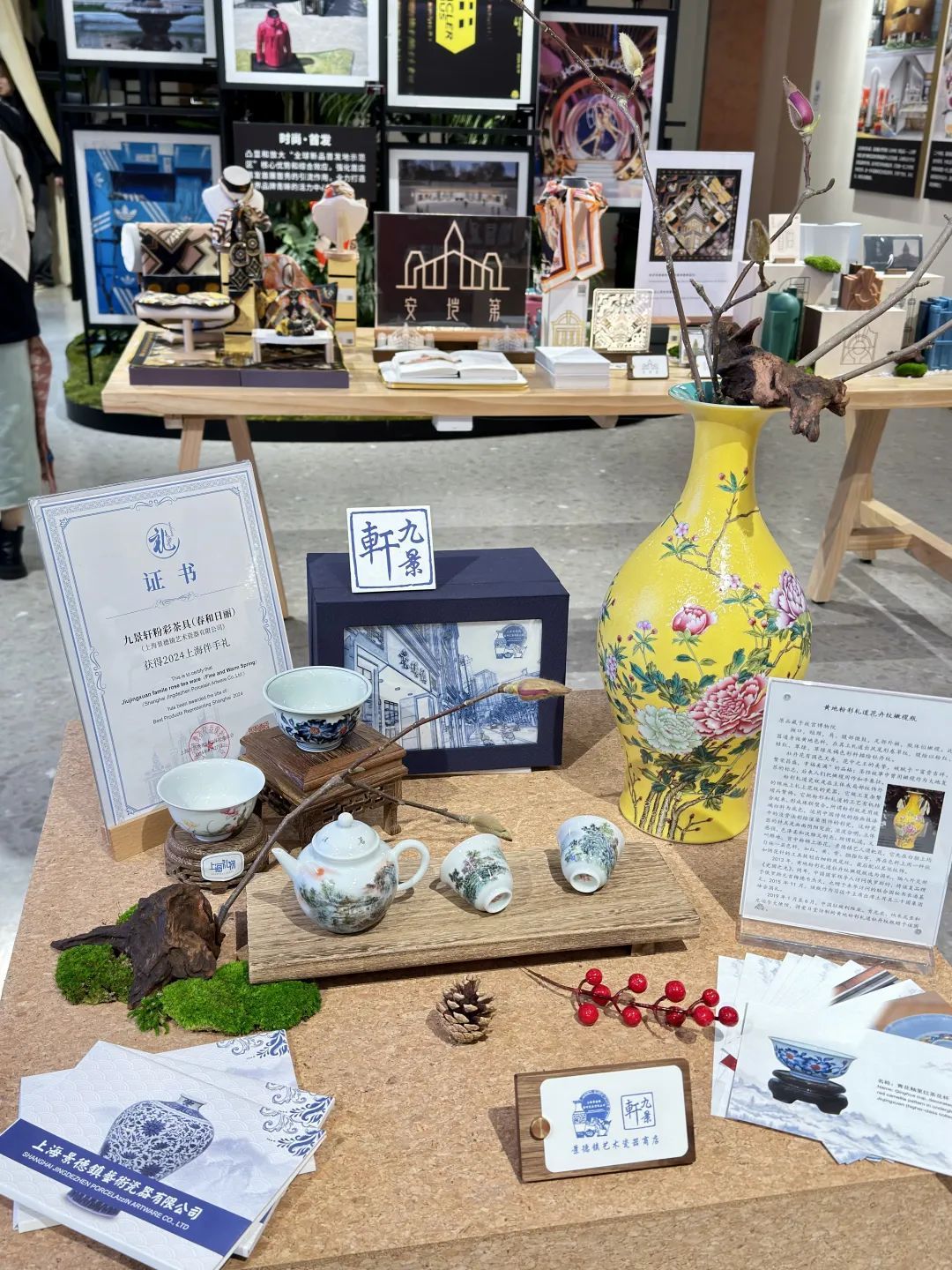 九百集团旗下上海老字号白玉兰真丝的CITYWALK丝巾系列、景德镇艺术瓷器的粉彩一壶二杯茶具——“春和日丽”茶具等老字号新品,体现了静安老字号守正创新的匠心精神。