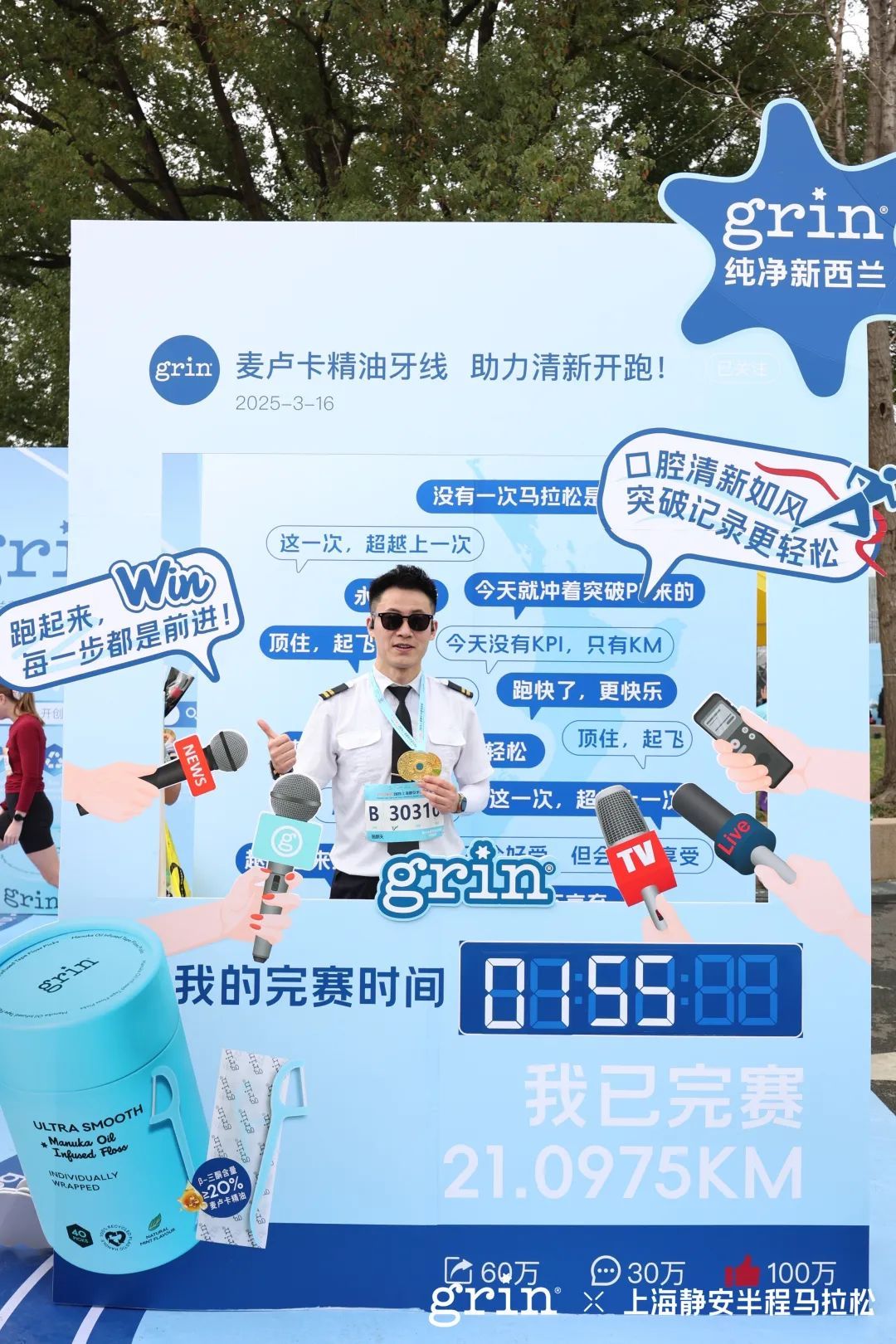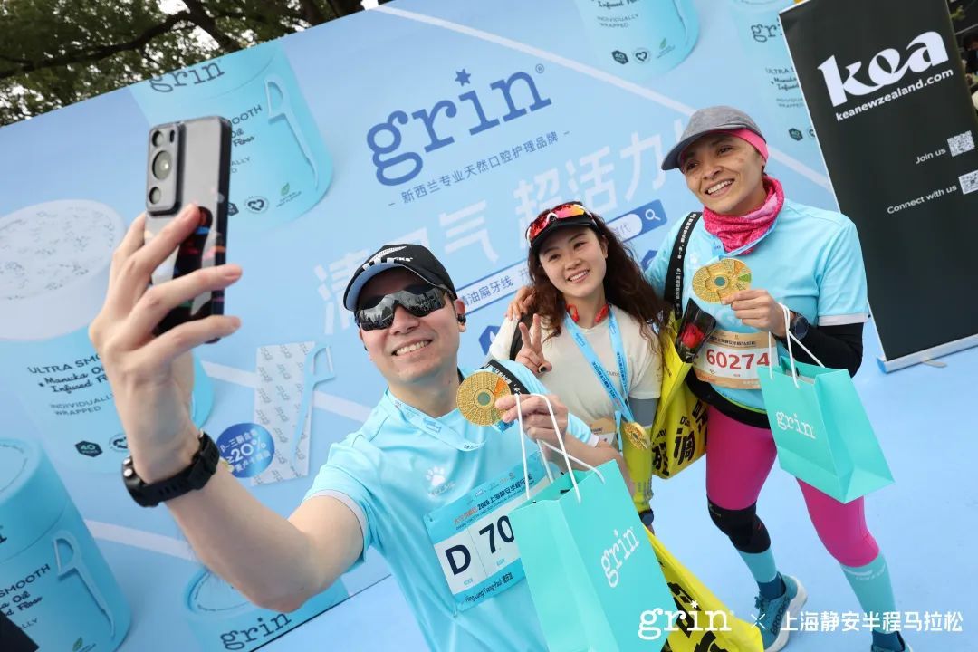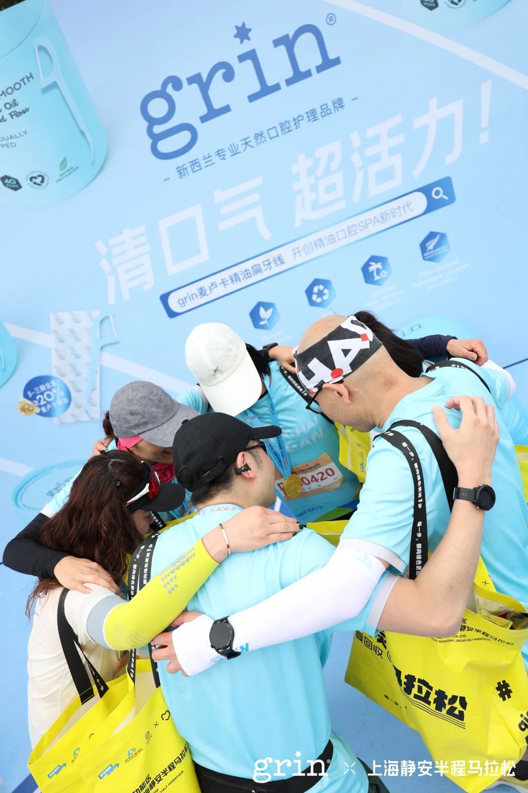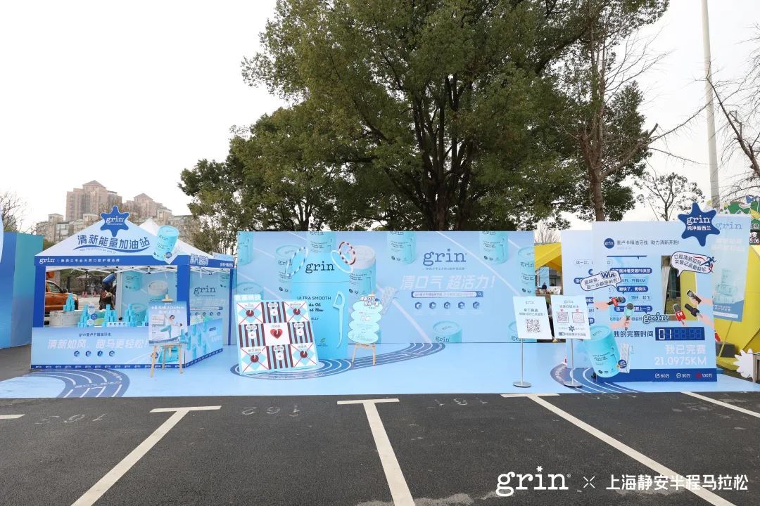 在赛事现场,grin打造的活力与趣味并存的互动广场——“超清新运动场”,成为人气焦点。早上6时起,就有跑者与“grin‘蓝’朋友”玩偶合影打卡,领取口腔护理礼包。