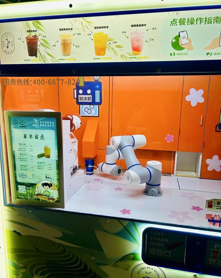 会场外展台上,一台机械臂“茶艺师”——碧螺春茶饮机器人成为关注焦点。消费者通过扫码下单后,机械臂立即启动全流程自动化操作,取杯、注水、调制、封口等步骤无缝衔接,90秒即可完成一杯香飘四溢的定制茶饮。