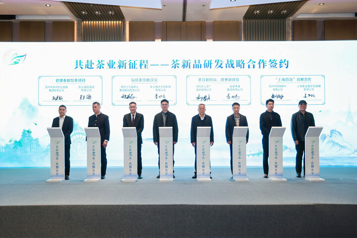 从甜品跨界到茶酒创新,从文化赋能到餐饮融合,碧螺春正以多元姿态拥抱市场。会上,部分洞庭山碧螺春茶企与知名企业签订茶新品研发战略合作协议,涵盖茶酒创新、文化赋能、餐饮融合等多个领域,携手探索茶产业链的延伸发展。