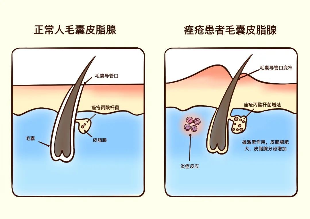 2. 毛囊皮脂腺导管角化异常:毛囊皮脂腺导管角化过度会导致管口变小、狭窄或堵塞,影响皮脂的正常排出,进一步加重痤疮的发生。