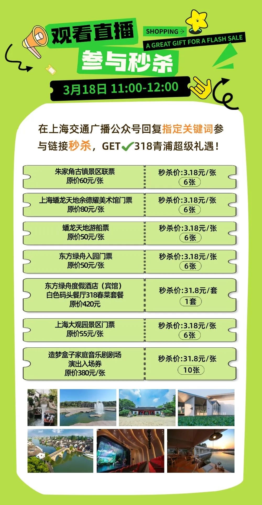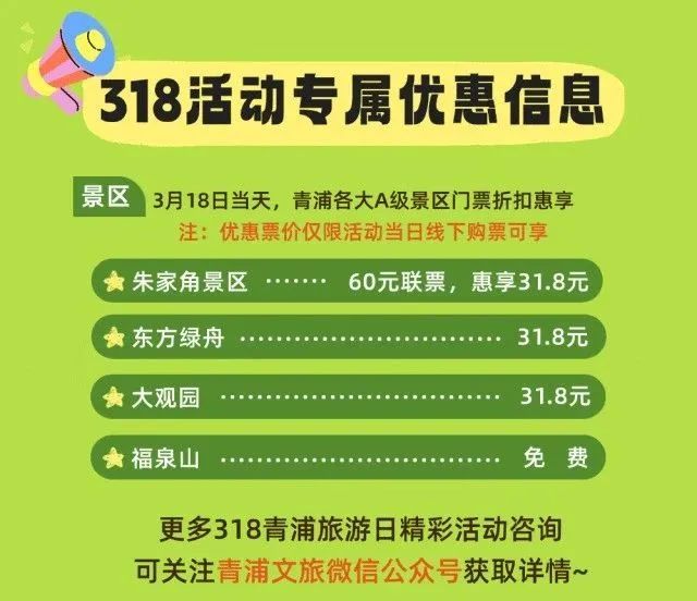 线下福利:318当天,朱家角景区、东方绿舟景区、上海大观园景区线下购票入园仅需31.8元!