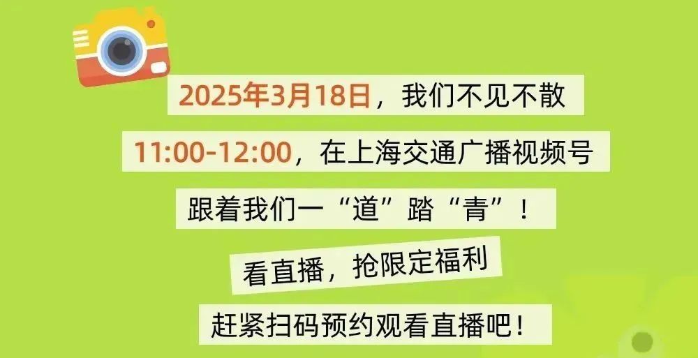 1️⃣ 扫码预约:立即保存海报下方二维码,关注“上海交通广播视频号”,点击预约直播!或在“绿色青浦视频号”“青浦文旅视频号”观看转播~