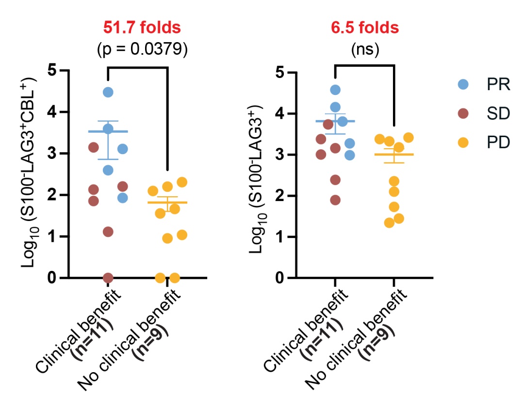 基于上述LAG3激活机制的发现,研究团队开发出了一种新型的疗效预测生物标志物。结果表明,这种表征LAG3受体激活状态的功能性生物标志物(Functionality Biomarker)较传统的单一表征LAG3表达的生物标志物(Expression Biomarker)有非常显著的优势:在临床研究中,功能性生物标志物能够准确区分治疗获益人群,其表达水平在获益组较非获益组升高51.7倍(p = 0.0379);相比之下,传统表达生物标志物仅显示出6.5倍的差异且无统计学意义(图2)。