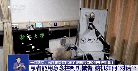 在浙江大学医学院附属第二医院,一位77岁的高位截瘫患者通过脑中想象,一旁的机器臂在白板上写出“浙江大学”四个字。5年前,专家团队在患者脑中植入两块4毫米大小的芯片,通过微小电流让脑细胞与计算机互动,驱动机械手臂,实现“脑控”写字,与正常人的书写反应仅相差0.2秒。目前,100个常用汉字中,患者“脑控”书写的正确率达到96%。