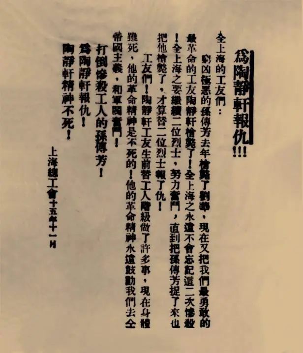 1926年11月17日,上海总工会发出宣言,“我各业工友,一致奋斗到底,为死者申冤,为生者谋保障。”11月18日,上海区委发出《为陶静轩同志致哀的通告》,“我们最忠勇的同志陶静轩,死于军阀孙传芳武装统治下的上海戒严司令部之手”。11月19日,上海区委召开主席团会议,追悼陶静轩,要求上海总工会发通告和《斥孙传芳枪杀陶静轩烈士的传单》,小沙渡、码头总工会开追悼会,上海总工会刊登启事。
