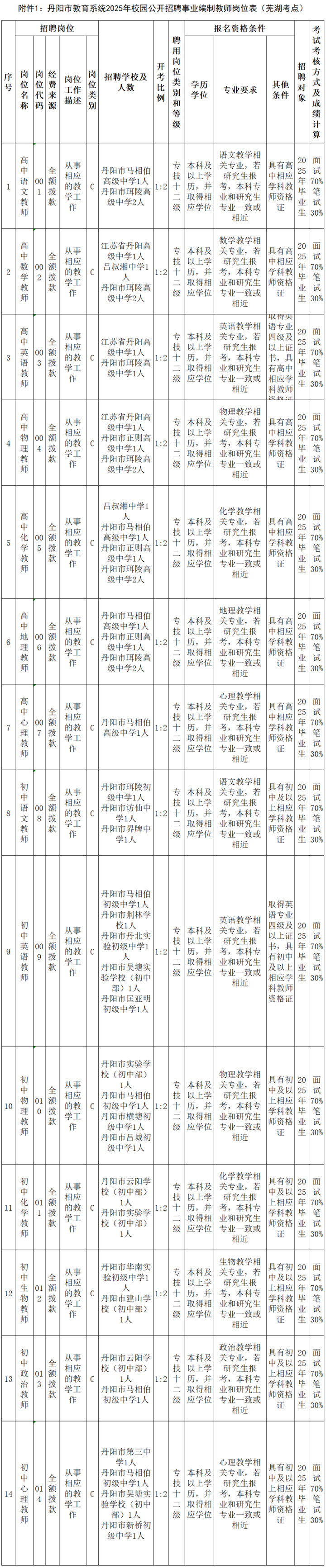 丹阳市教育系统面向社会公开招聘全额拨款事业编制教师45名。