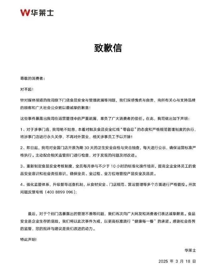 3月18日,华莱士郑州一门店被曝“全员的健康证都是假证”引发广泛关注。当天,华莱士官方微博发布道歉信:涉事门店永久关停,涉事员工予以开除!全国门店开展30天的卫生自检、抽查。据报道,在网络平台上,不少顾客投诉食用华莱士餐品后出现呕吐、腹泻等症状。今年2月份以来,记者随机在河南郑州、安徽合肥的华莱士两家门店进行卧底暗访,发现存在频繁修改“效期标签”,使用过期食材制作餐食的情况。此外,全员的健康证也都是找中介办的假证。