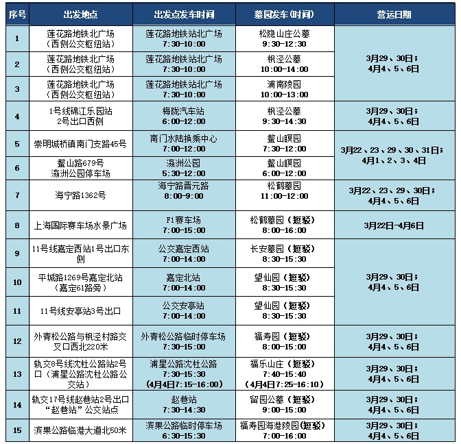 今年祭扫总客流较高,人、车流量集中在3月29、30日,4月4、5、6日5天,其中4月4日正清明为祭扫高峰。从3月22日起,上海开通15条清明定点扫墓班车,共投入307辆营运车辆,其中8条短驳车实行免费乘坐,覆盖本市嘉定、青浦、金山、崇明等十余家公墓。定点班车实行两点一线直达车的营运方式。
