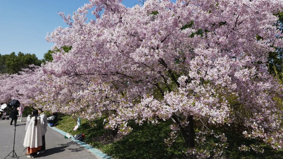 目前,顾村公园内种植的樱花超过13000株,引进品种达120多种,整体花期可持续超过60天。园方表示,随着本周天气持续晴好,在阳光和温度的催生下,早樱品种如大鱼樱、河津樱、大寒樱等将进入“樱花雨”阶段。