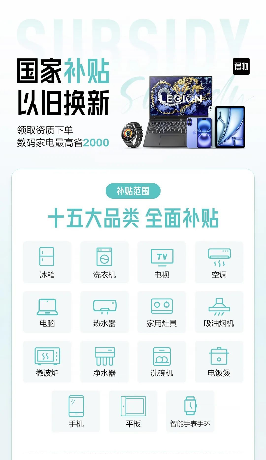 据介绍,在上海、浙江区域的用户购买单件6000元以下的手机、平板、智能手表手环这3类数码产品,能享受15%(最高不超500元)的立减补贴;购买单件12类家电产品及电脑,则可享受15%-20%(最高不超2000元)的立减补贴。