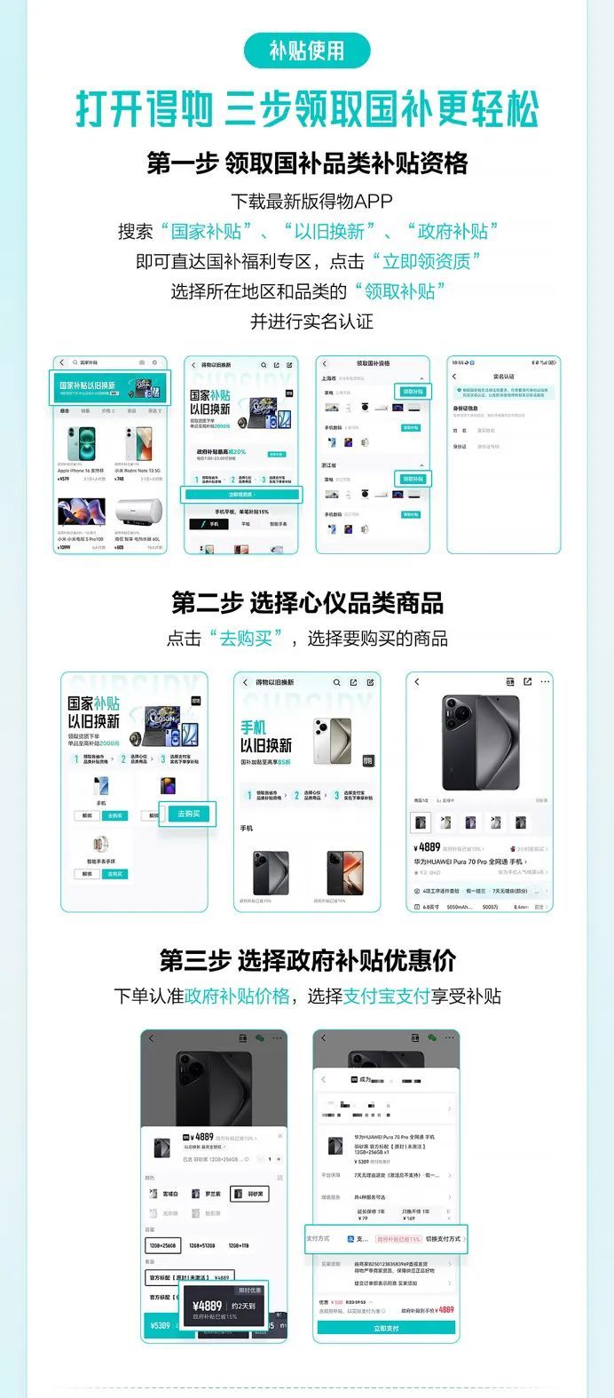 为让消费者享受更低价格,在现有国补优惠基础上,符合条件的用户还能继续享有新人折扣等原有福利。2024年在其他平台已享受以旧换新补贴的个人消费者,2025年在得物平台购买同类产品,仍可按国补价格享受补贴。例如,Apple iPhone 16(256G)手机,得物国补后最低可达5499元;小米新一级能效巨省电空调1.5匹,得物国补后最低可至1839元。(实际价格以平台最终显示为准)