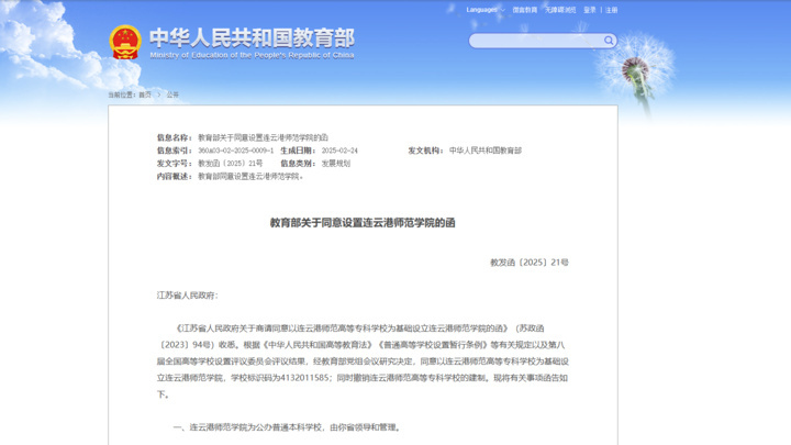 日前,教育部发布《关于同意设置连云港师范学院的函》,根据《中华人民共和国高等教育法》《普通高等学校设置暂行条例》等有关规定以及第八届全国高等学校设置评议委员会评议结果,经教育部党组会议研究决定,同意以连云港师范高等专科学校为基础设立连云港师范学院,学校标识码为4132011585;同时撤销连云港师范高等专科学校的建制。