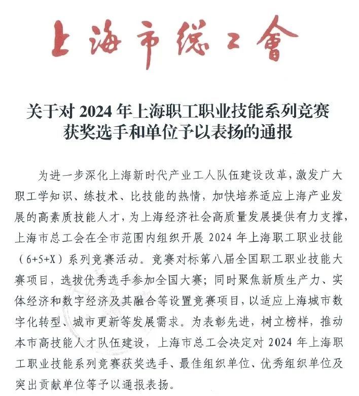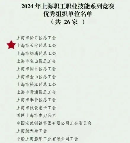 上海市总工会日前发布了《关于对2024年上海职工职业技能系列竞赛获奖选手和单位予以表扬的通报》,长宁区总工会喜获“优秀组织单位”,并有多名来自长宁各领域的选手在竞赛中获得荣誉。