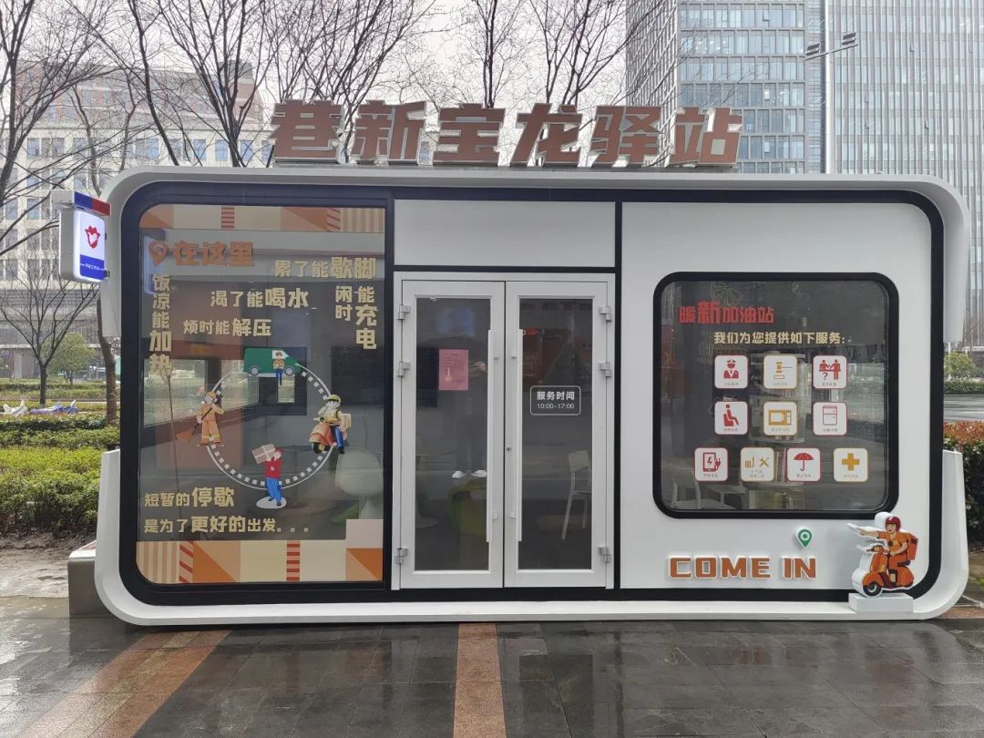 在宝龙广场东片,过去设置的“小哥驿站”空间较小、服务功能单一,无法满足他们的实际需求。根据反馈,宝龙街区党总支将问题提交至党建联席会议进行会商,让“多元参与”“共建共治共享”有的放矢。网格长牵头召集了城管、消防、物业等相关部门,经过系统会商后,小哥驿站升级改造成“巷新宝龙驿站”,丰富和优化了内部设施的同时,还为周边企业提供宣传平台,叠加多重功能,强化服务能级。