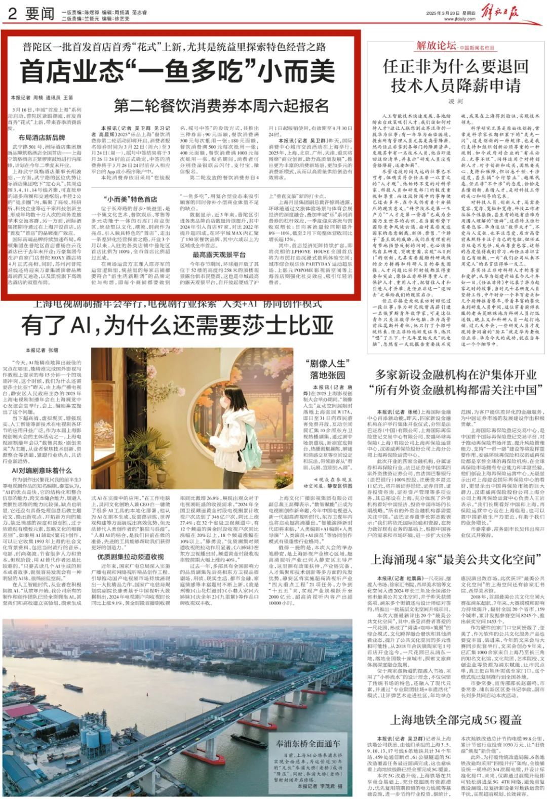 今天(3月20日),《解放日报》要闻版刊登了《首店业态“一鱼多吃”小而美》,一起来阅读全文↓