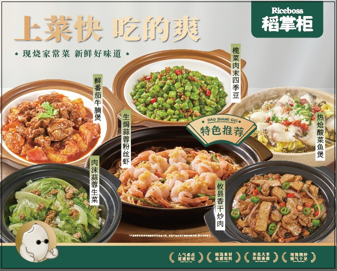 而稻掌柜则更偏向中式快餐,秉承“严选食材,现烧现炒”原则,米饭选用优质东北大米现煲而成,浓郁的煲类菜品则富有锅气小炒,每一口都与香糯的米饭交汇出丰富口感。