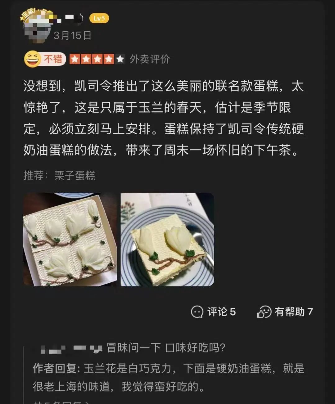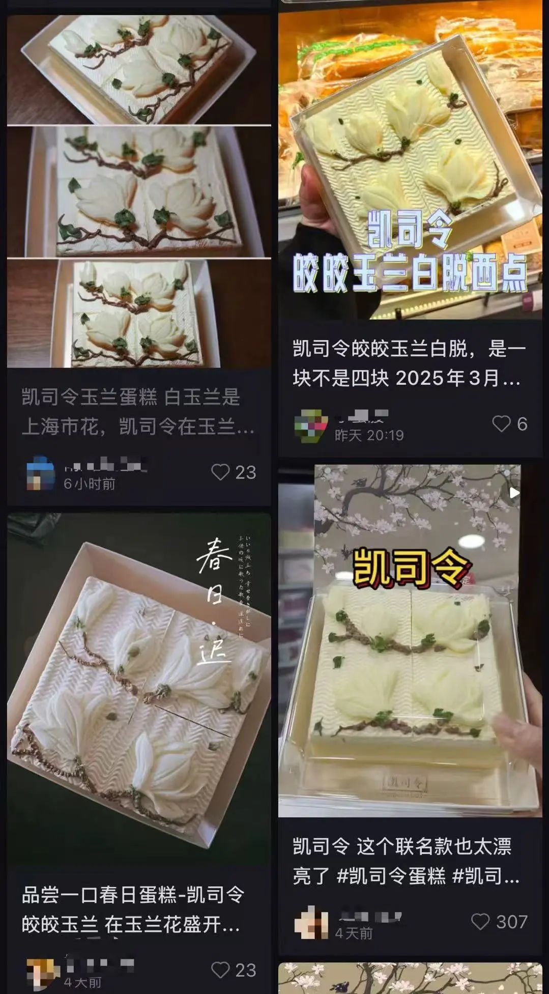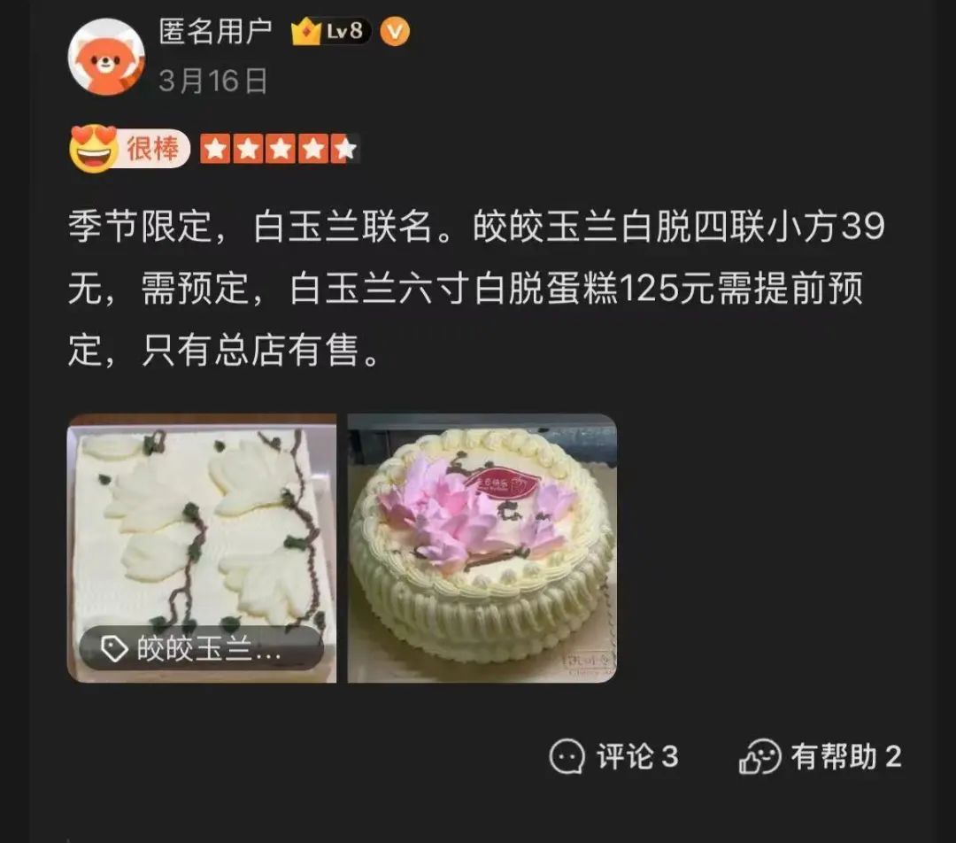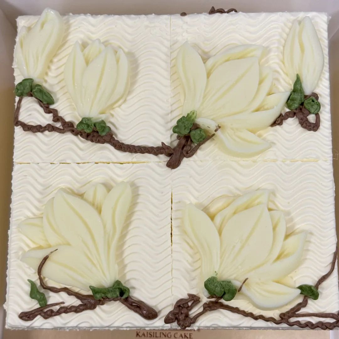 “阿拉小辰光最欢喜吃白脱蛋糕,都好这一口硬奶油,满满的童年味道,没想到现在还有白玉兰造型,颜值太高了,上海人的DNA动了!”