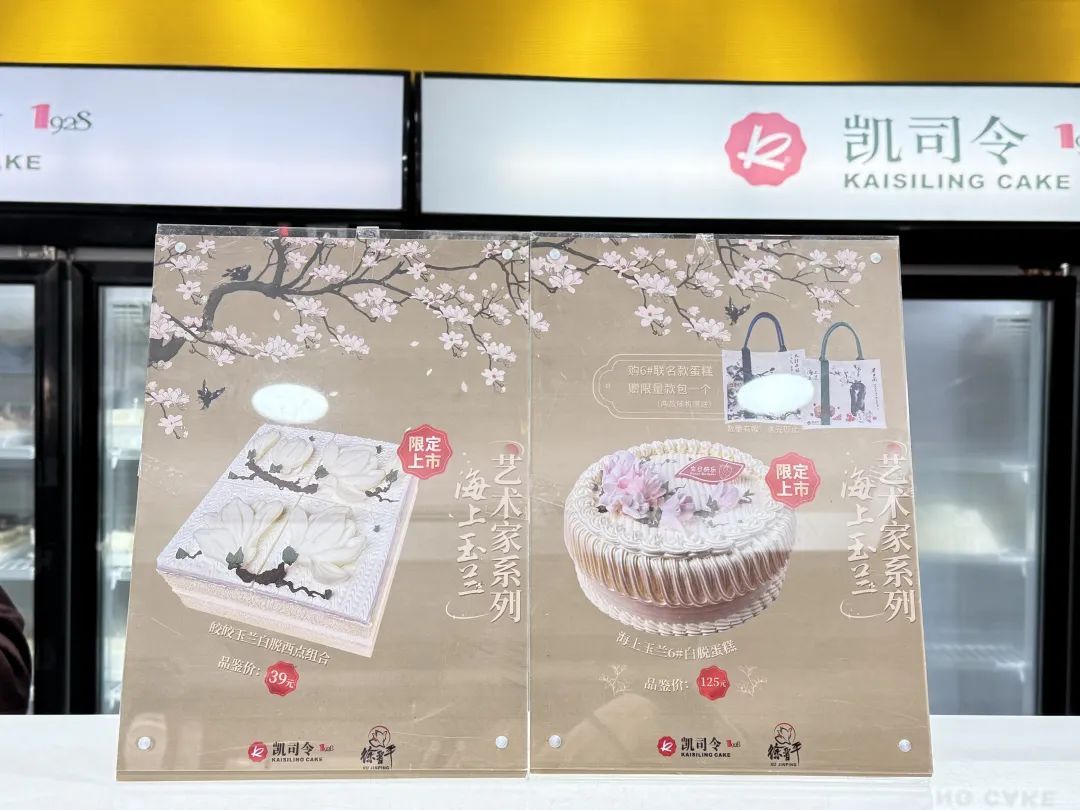 上海南京西路上的老字号西点品牌凯司令的门店橱窗内,一场传统与艺术的对话正悄然绽放——老字号凯司令以上海市花白玉兰为灵感,携手当代知名画家徐晋平,跨界推出春日艺术限定款蛋糕西点,近日已正式上市。