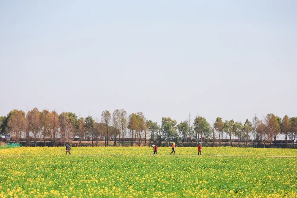 蔡浜村的油菜花田不仅规模壮观,更因独特的地理位置而别具韵味。花海与湖面相接,游客可以感受金色浪潮与湖面波光交融的无限延伸感,除了赏花打卡拍照,游客还可以沿着湖边骑行,感受春日的阳光与轻风。