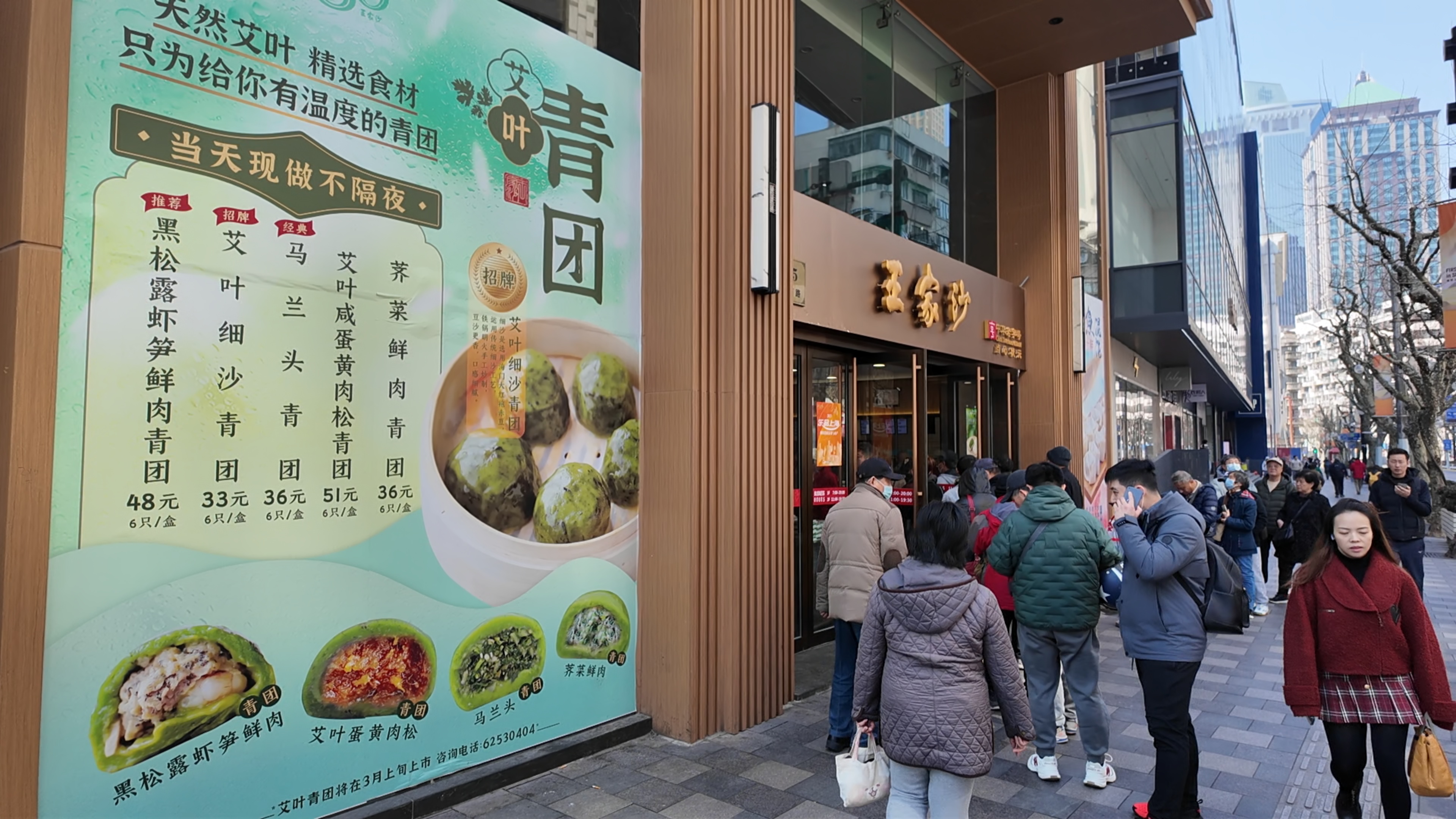 上午十点,王家沙南京西路总店门口已然排起长队。店内柜台里,青团包装盒上氤氲的水蒸气,彰显着刚出炉的新鲜。艾叶细沙、咸蛋黄肉松、枣粒核桃等口味备受欢迎,顾客们纷纷指名购买。