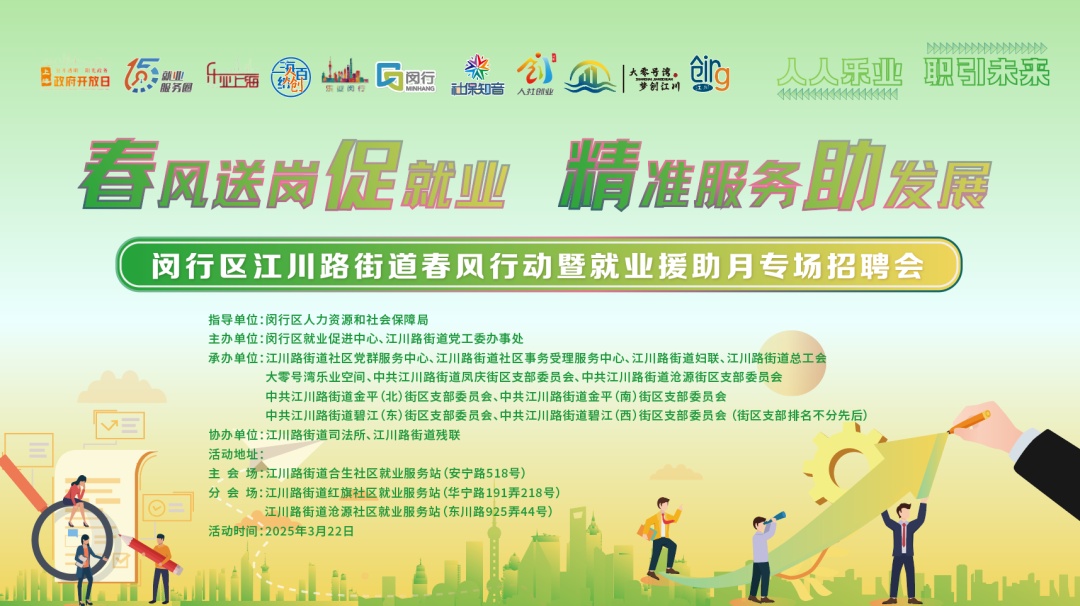 活动时间 3月22日13:00,江川路街道三个会场同步启动,助力大家“好就业、就好业”! 活动地点 合生社区就业服务站(主会场) 地址:安宁路518号 红旗社区就业服务站(分会场) 地址:华宁路191弄218号 沧源社区就业服务站(分会场) 地址:东川路925弄44号 温馨提示 1.本活动仅供企业发布招聘信息。由招聘单位对其发布的职位信息材料的真实性、准确性和合法性及所有招聘程序、流程、结果等负有全部责任。 2.求职者在与企业沟通或面试过程中,若发现企业对于岗位信息的介绍与实际情况不符,尤其是在社保缴纳方面存在问题(如明确表示不缴纳社保),应立即终止沟通或面试,并向主办方反馈相关情况。 3.本活动全程不产生任何费用,如有工作人员以添加微信或其他联系方式的形式索取“手续费、中介费”等情况的,绝不可相信。 转载请注明来自今日闵行官方微信