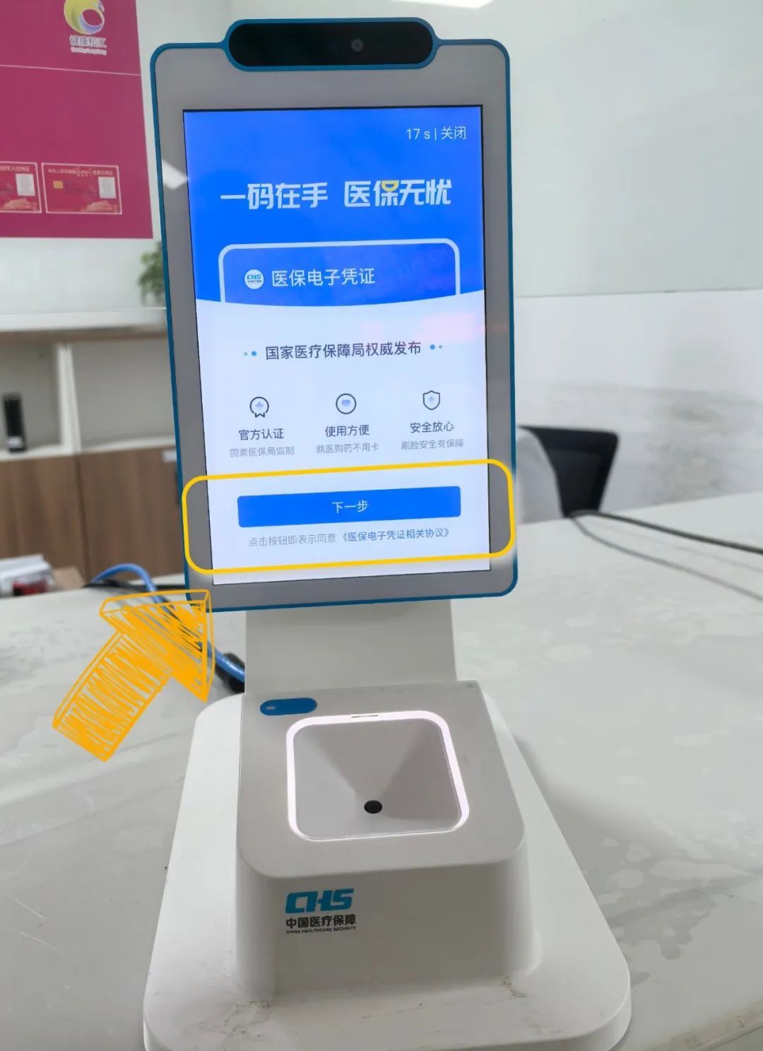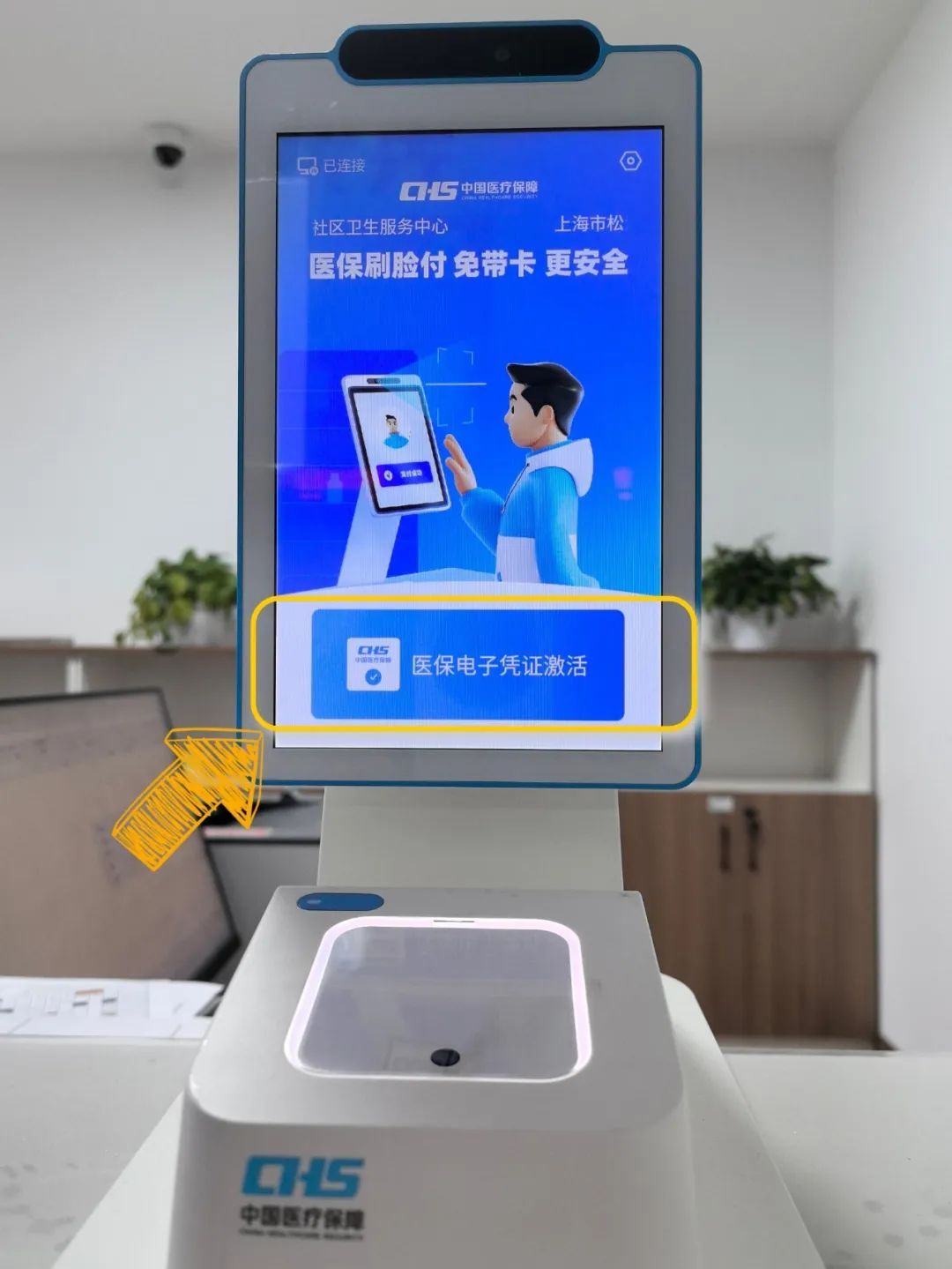 暂未开通医保码的参保人,可到达中心窗口后选中“刷脸付”设备屏幕上的医保电子凭证激活现场扫脸。