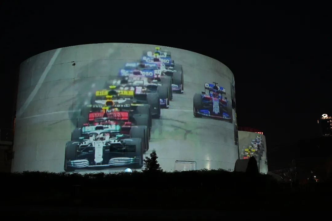 夜幕落下,西岸油罐艺术中心的1、2号罐被震撼的画面点亮。轮胎与赛道激烈摩擦溅起阵阵火星,疾驰的赛车如红色闪电划破夜空。
