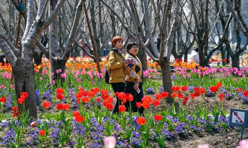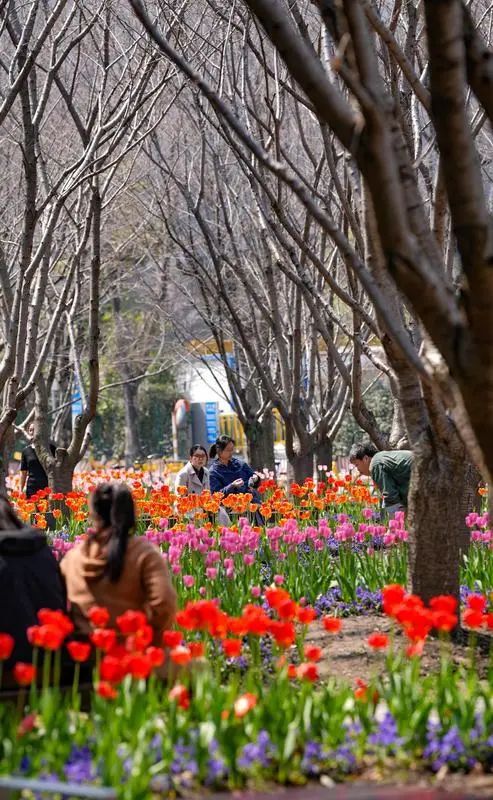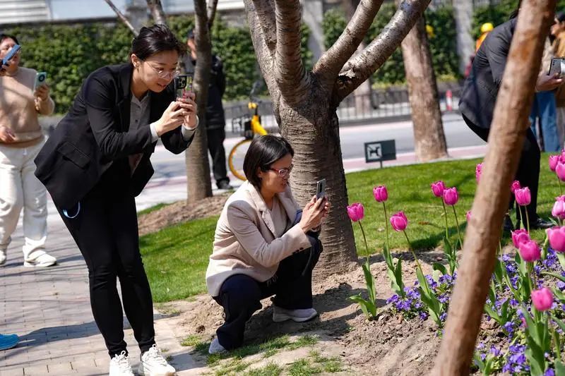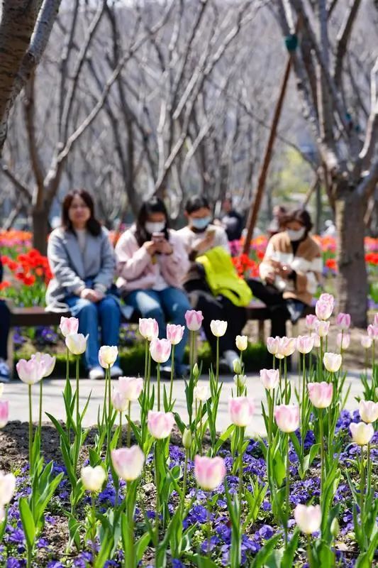 附近商务楼的白领们也趁着午休时间,来到花间拍照留念。他们或漫步或驻足,享受片刻宁静,为繁忙的工作日增添了一丝诗意与浪漫。