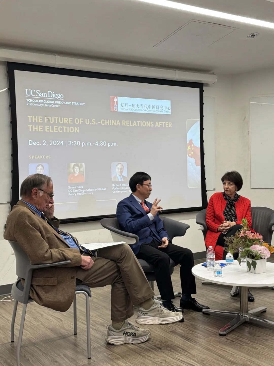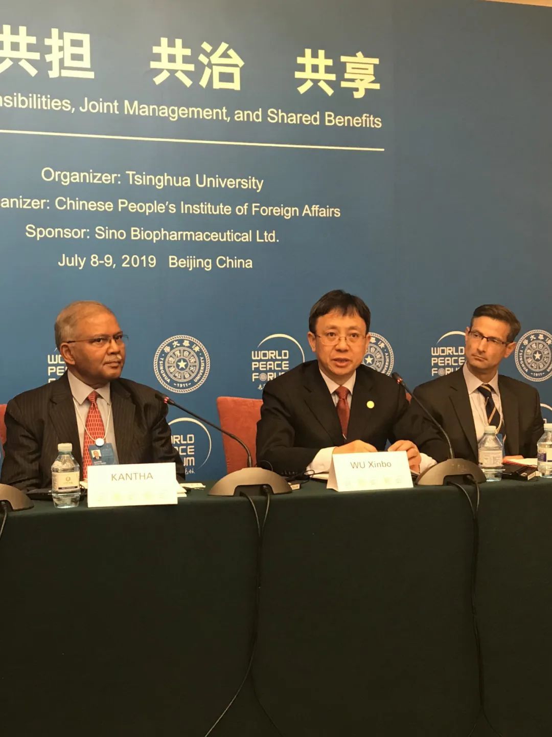 上图:吴心伯出席美国圣地亚哥加州大学举行的中美关系报告会;下图:吴心伯出席世界和平论坛