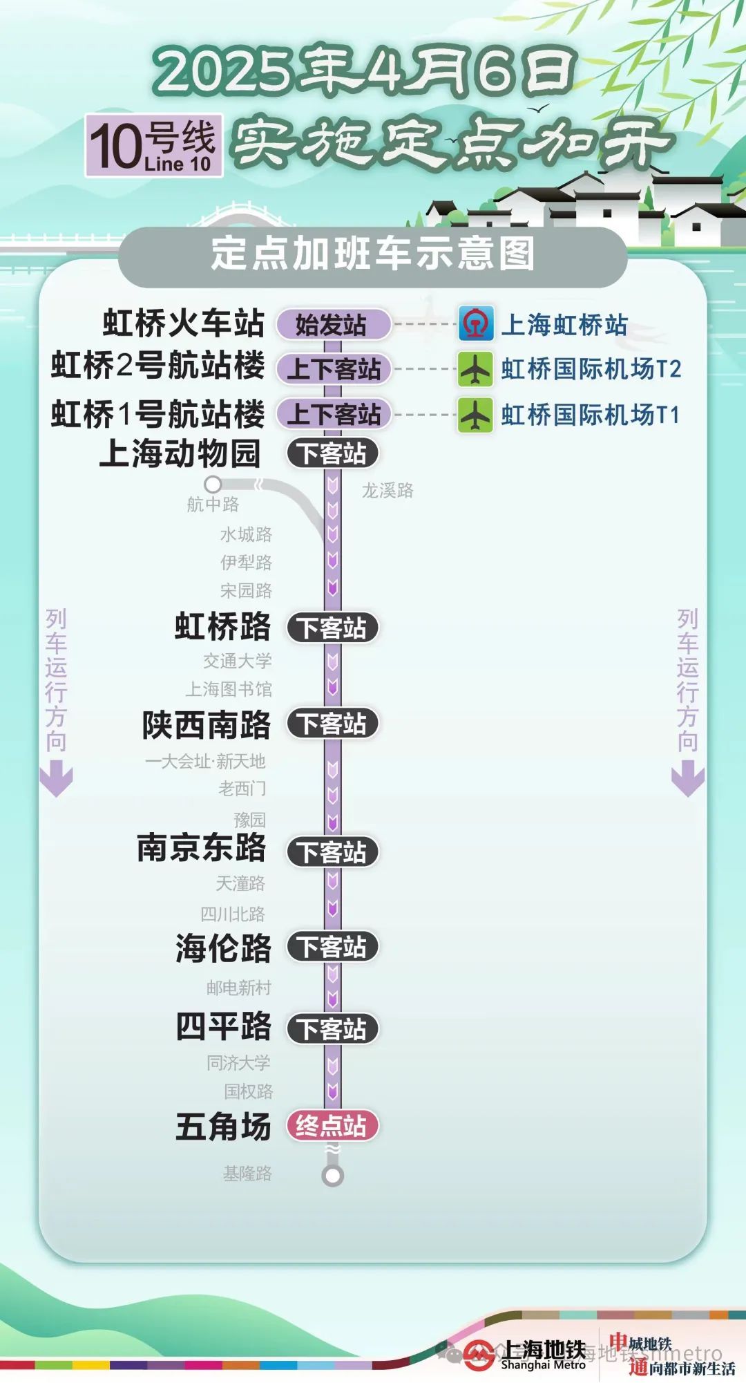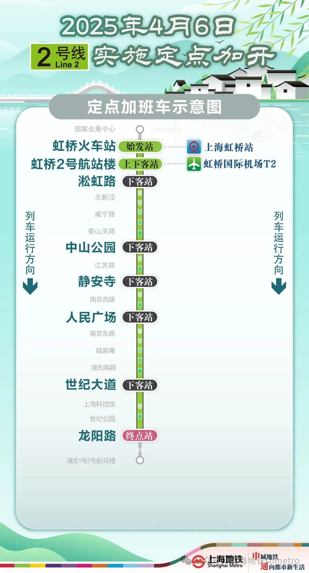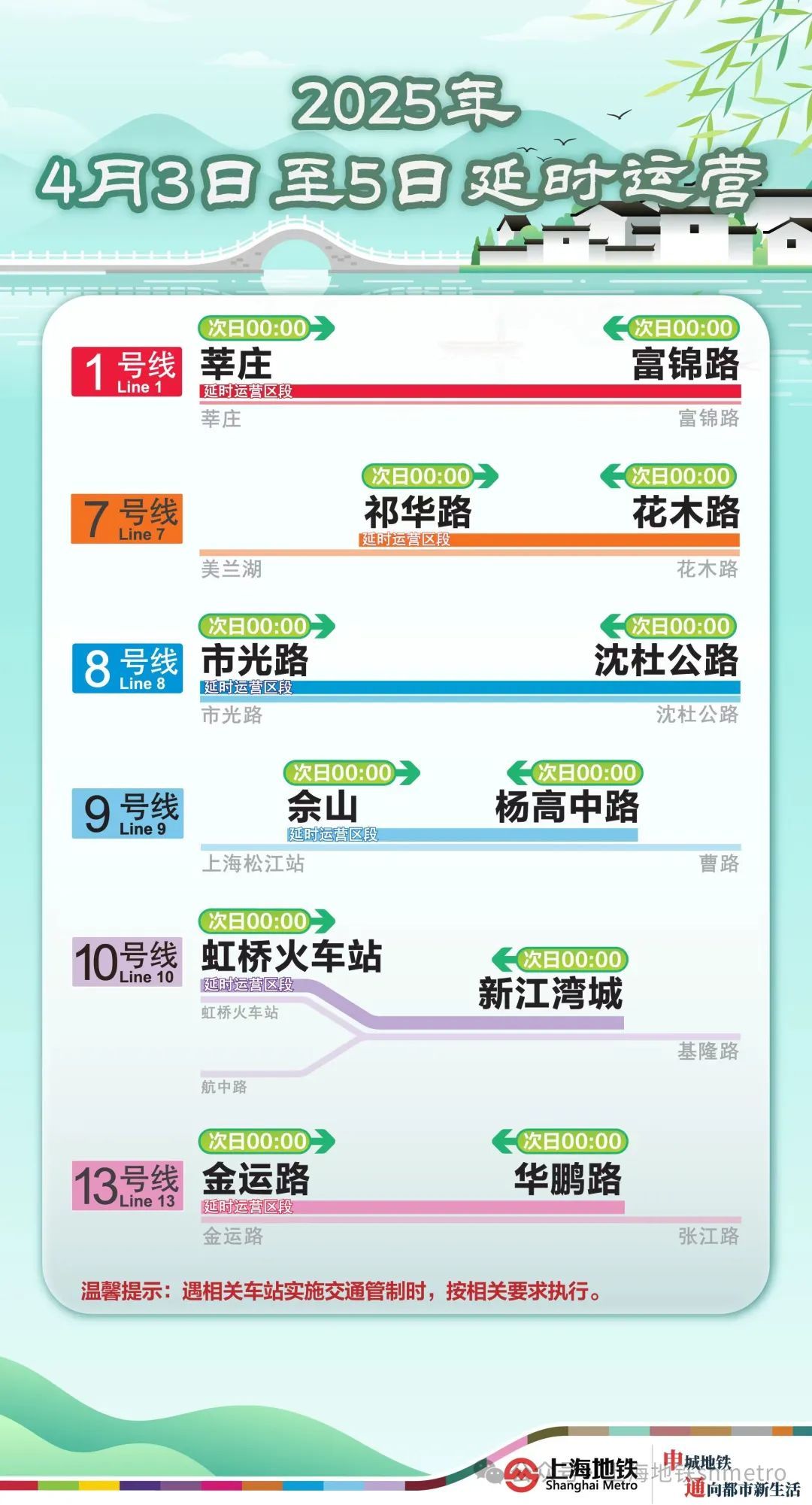 申通地铁集团介绍,随着“清明”小长假的来临,扫墓客流将集中出行。为更好地满足市民乘客出行需求,特制定专项运营组织方案。通过8线18站“地铁+公交接驳专线”服务、相关线路投用扫墓专用图、增投备车、延时运营、定点加开、加强引导和现场疏导等一系列措施,确保地铁运营平稳有序。运营计划详见↓ 清明祭扫客流高峰形成 多家墓园推行“地铁+短驳”通行方式 2025年清明节假期为4月4日(周五)至4月6日(周日)。预计清明假期全网日均客流约787万人次,同比去年小幅上升,而祭扫高峰出现在3月29日至30日、4月4日至6日。届时,全网络整体出行路径将呈现早晨往郊区方向流动,中午往市区方向集中返回的潮汐特征。 今年本市多家墓园仍延续推行“地铁+短驳”服务,其中,涉及轨道交通2、5、8、9、11、16、17、18号线,共8线18站,届时相关站点客流将会呈现集中到达,上升明显的特征。需要提醒的是,由于各座公墓短驳车的开行日期、时间段和间隔都有所不同,计划祭扫的乘客在出行前应事先掌握相关信息,以免耽误出行。 祭扫客流出行高峰日 11号线启用扫墓专项运行图 4月3日至5日 六线延时运营 清明保障期间,上海地铁全网将提升保驾等级。为了满足清明扫墓客流需要,在3月29日、30日以及4月4日至6日,11号线将启用“扫墓”专项列车运行图,调整列车运行交路、增加上线列车,进一步缩短涉墓区段在祭扫高峰日的运营间隔。在此基础上,上海地铁还将关注今年祭扫初期客流与 F1 赛事客流叠加影响、工作日祭扫客流与通勤客流叠加、首班车等候客流、早高峰可能提前等情况,在确保早高峰运能的基础上,灵活采用列车提早出库、首班车后加开载客列车、大小交路调整等方式做好运营组织,必要时利用备车、高峰回库列车进行加开调整。另外,墓园接驳站点等大客流车站还将密切关注客流波动,加强现场客流引导。 同时,4月3日至5日,上海地铁1、7、8、9、10、13号线延时运营。 4月6日 1、2、10、17号线增开定点加班车至24时 为做好节假日返程期间枢纽站客流疏散工作,2025年4月6日(周日)1、2、10、17号线实施定点加开方案,加开末班车延长至24:00。具体加开方式如下: 1号线上海南站站往富锦路站方向: 在上海南站站末班车(22:42)后加开4列定点加班车运行至富锦路站,加班车停靠上海南站站、徐家汇站、人民广场站、上海火车站站、上海马戏城站、彭浦新村站、通河新村站、富锦路站(终点站),其余车站不停靠。停靠车站中,上海南站站(始发站)、上海火车站站可上下客,其余车站只下不上。 1号线上海火车站站往莘庄站方向: 在上海火车站站末班车(23:00)后加开4列定点加班车运行至莘庄站,加班车停靠上海火车站站、人民广场站、徐家汇站、上海南站站、莘庄站(终点站),其余车站不停靠。靠车站中,上海火车站站(始发站)、上海南站站可上下客,其余车站只下不上。 2号线虹桥火车站站往龙阳路站方向: 2号线在虹桥火车站常态定点加班车(23:30)的基础上加开2班定点加班车。加班车沿途停靠虹桥火车站站、虹桥2号航站楼站、淞虹路站、中山公园站、静安寺站、人民广场站、世纪大道站、龙阳路站(终到站),其余车站不停靠。停靠车站中,虹桥火车站站(始发站),虹桥2号航站楼站可上下客,其余车站只下不上,途经换乘站不可换乘。 10号线虹桥火车站站往五角场站方向: 10号线在虹桥火车站站常态定点加班车(23:00)后加开4列定点加班车,加班车停靠虹桥火车站站、虹桥2号航站楼站、虹桥1号航站楼站、上海动物园站、虹桥路站、陕西南路站、南京东路站、海伦路站、四平路站、五角场站(终点站),其余车站不停靠。停靠车站中,虹桥火车站站(始发站),虹桥2号航站楼站、虹桥1号航站楼站可上下客,其余车站只下不上。 17号线虹桥火车站站往朱家角站方向: 17号线在虹桥火车站站下行末班车(23:00)后加开4班定点加班车。加班车沿途停靠虹桥火车站站、徐泾北城站、汇金路站、漕盈路站、朱家角站、西岑站(终点站),其余车站不停靠。停靠车站中,虹桥火车站站(始发站)可上客,其余车站只下不上。 温馨提示 1. 由于各墓园短驳车的开行日期、时间段和间隔都有所不同,计划祭扫的乘客在出行前应事先掌握相关信息,以免耽误出行。 2. 如出现极端大客流,为保障运营秩序及乘客安全,相关车站将根据实际情况进行限流、设置护栏引导客流走向等临时调整措施,届时请听从工作人员指引,或根据导向指示,有序进出车站、上下列车。 3. 文明祭扫,请主动配合安检,严禁携带易燃易爆物品(如鞭炮、火烛等)乘坐地铁。 4. 建议老年乘客及行动不便者尽量有人员陪同,避峰出行,并使用无障碍设施。需要帮助请拨打服务热线64370000或求助现场工作人员。 来源:申通地铁 精彩看点 上海市交通委宣传展示中心