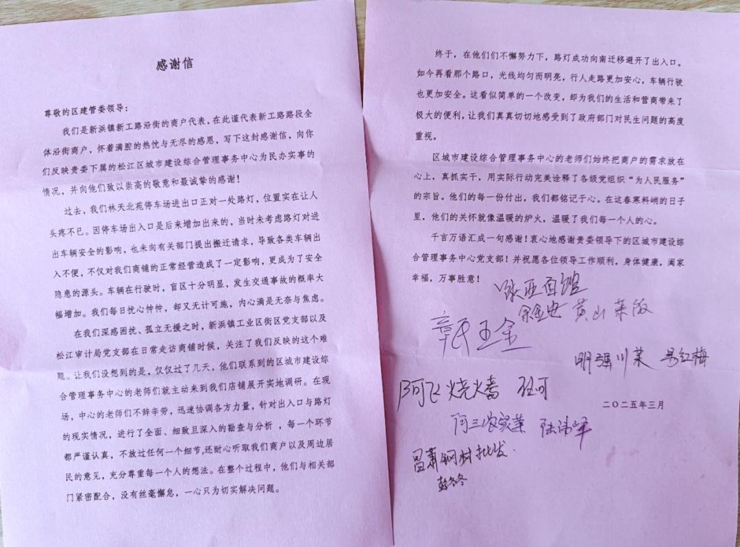 近日,松江区城市建设综合管理事务中心收到了一封来自新浜镇新工路沿街商铺的感谢信。这封信承载着满满的感激,字里行间都是商户们的热忱与谢意,背后更有一段彰显为民服务担当、温暖新业态群体的动人故事。