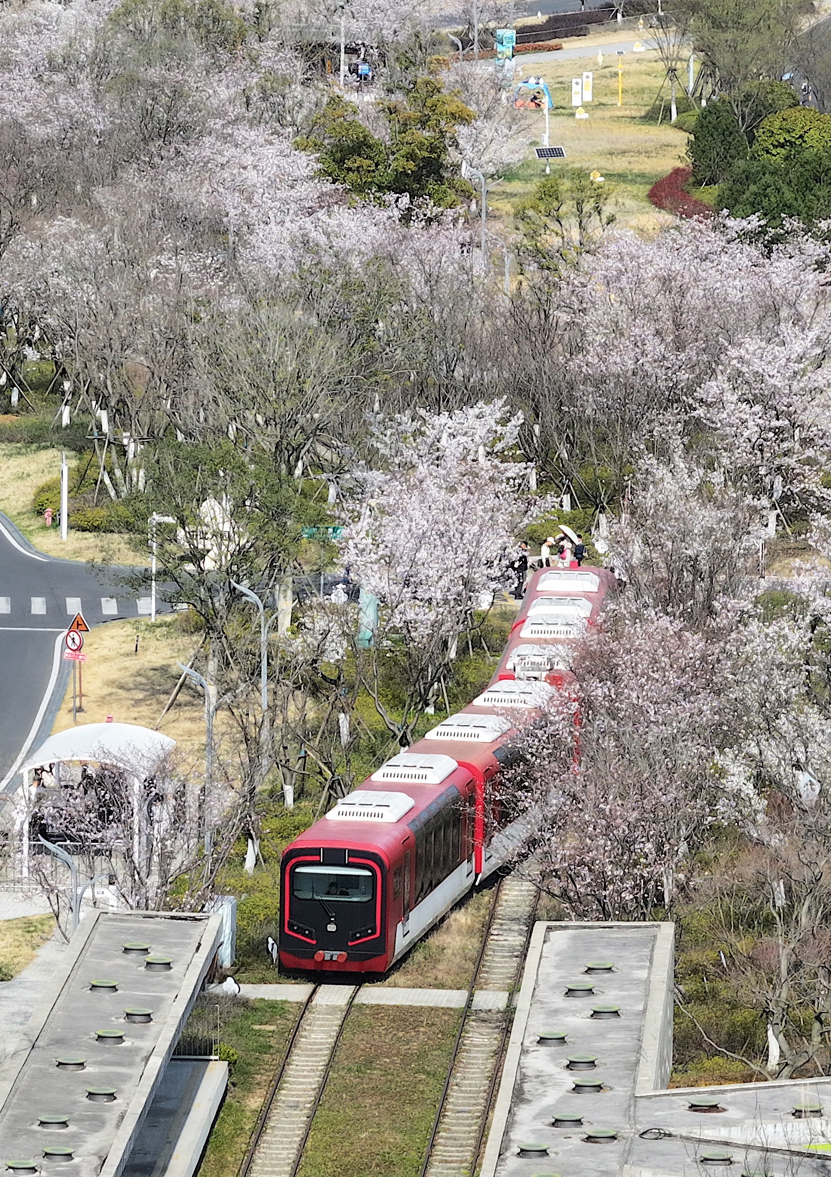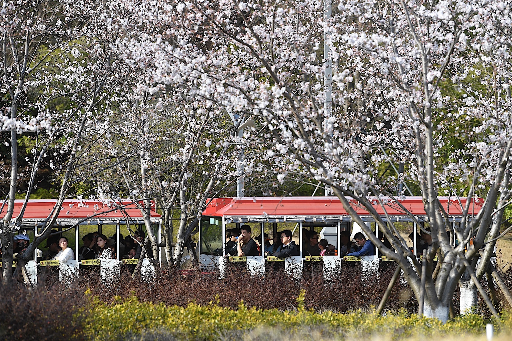 长达4公里的樱花大道从崖畔花谷蜿蜒至东宁门,复古造型的小火车穿行其间,恍如驶入粉白交织的“春日画卷”。