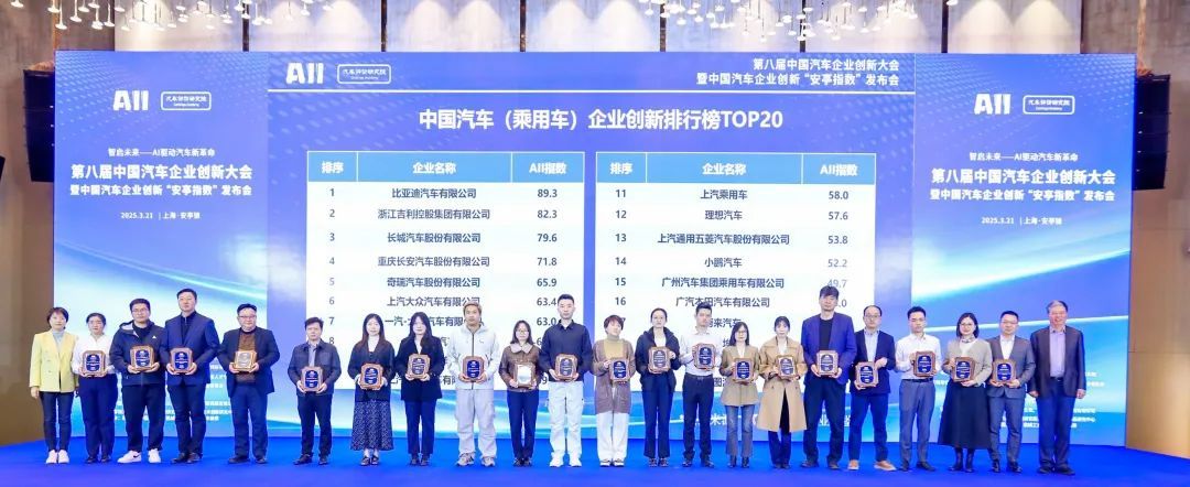 3月21日,“智启未来 ——AI 驱动汽车新革命”第八届中国汽车企业创新大会在安亭镇举行。新一轮中国汽车创新“安亭指数”同期发布,在最受关注的中国汽车(乘用车)企业创新排行榜上,比亚迪、浙江吉利、长城汽车占据前三甲。