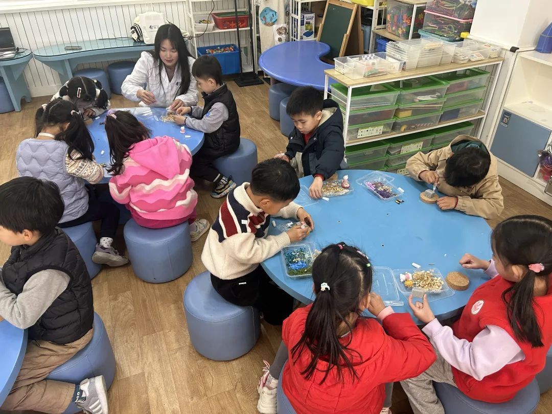 当理论认知告一段落,实践创作的热情迅速被点燃,孩子们成为满怀创意的 “小小花艺师”。眼前摆放着经过脱水处理,但色泽依旧艳丽的干花,以及形态各异的迷你摆件、精致工具,他们开动脑筋,小手忙碌不停。有的孩子专注挑选花朵,依据颜色、形状搭配组合,试图还原心目中梦幻的花园一角;有的孩子大胆创新,将干花与彩泥、小树枝相结合,赋予作品别样的立体感。