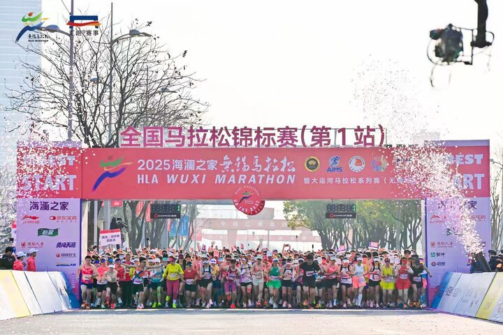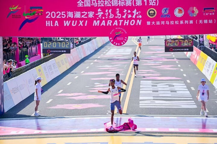 交汇点讯 3月23日上午7点,2025无锡马拉松鸣枪开跑,3.5万名跑友齐聚樱花赛道,参加全程、半程和欢乐跑三大赛项。结果来自埃塞俄比亚的两名选手Kuftu Tahir DADISO和Asimarech Naga MENGSITU分别跑出2小时23分42秒和2小时24分21秒,双双打破女子马拉松项目赛会纪录,并获得冠亚军。男子组冠军被厄立特里亚的Samsom Amare HAILEMICAEL获得,成绩是2小时07分00秒,中国选手杨绍辉以 2小时09分49秒获得全国锦标赛男子组冠军,女子组冠军被徐冰洁获得。