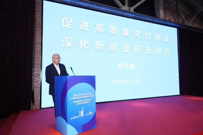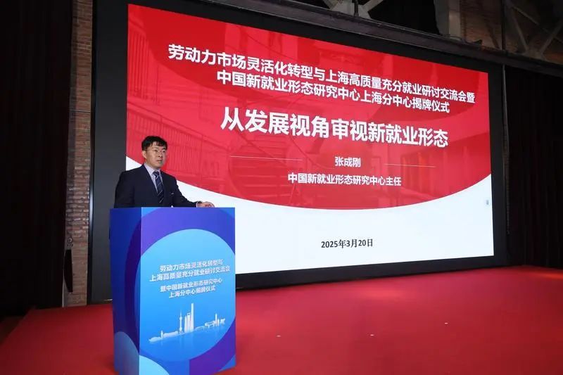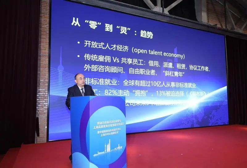 中国新就业形态研究中心主任张成刚以《从发展视角审视新就业形态》为题进行了主题演讲。演讲探讨了在人工智能时代,新就业形态作为劳动力市场重要组成部分的长期趋势进一步明确。新就业形态发展对于推动我国高质量充分就业有重要战略价值,平台组织劳动力资源的模式可以向多领域延伸,在更大范围内服务于劳动者和各类企业。中国新就业形态研究中心上海分中心将致力于新就业形态政策创新研究和人工智能+就业的实践创新研究,助力推动高质量充分就业发展。