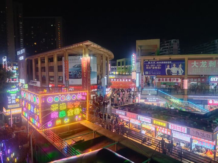 南京义乌美食城夜晚灯火通明。 在南京,义乌小商品城同样闻名遐迩。19日晚上9点左右,记者从龙眠大道地铁口2号口出来,眼前灯火通明,一片繁华景象。据了解,义乌小商品城2006年开业。由于靠近江宁大学城,消费群体以年轻学生为主。如今小商品城分为A区和B区,A区侧重于美食,远远就能看到“南京义乌美食城”7个大字,此外还有美甲、小饰品、玩具店等;B区业态主要为装饰建材、五金机电、窗帘服饰等。到了晚上,A区人声鼎沸。因人气极旺,不少美食店铺24小时营业。B区则显得较为冷清,一些店铺已经打烊。