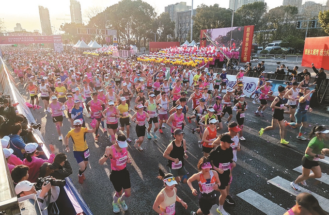 3月23日,无锡马拉松鸣枪开跑。在加油声中,3.5万名跑友从起点拱门,朝着终点奋力奔跑。