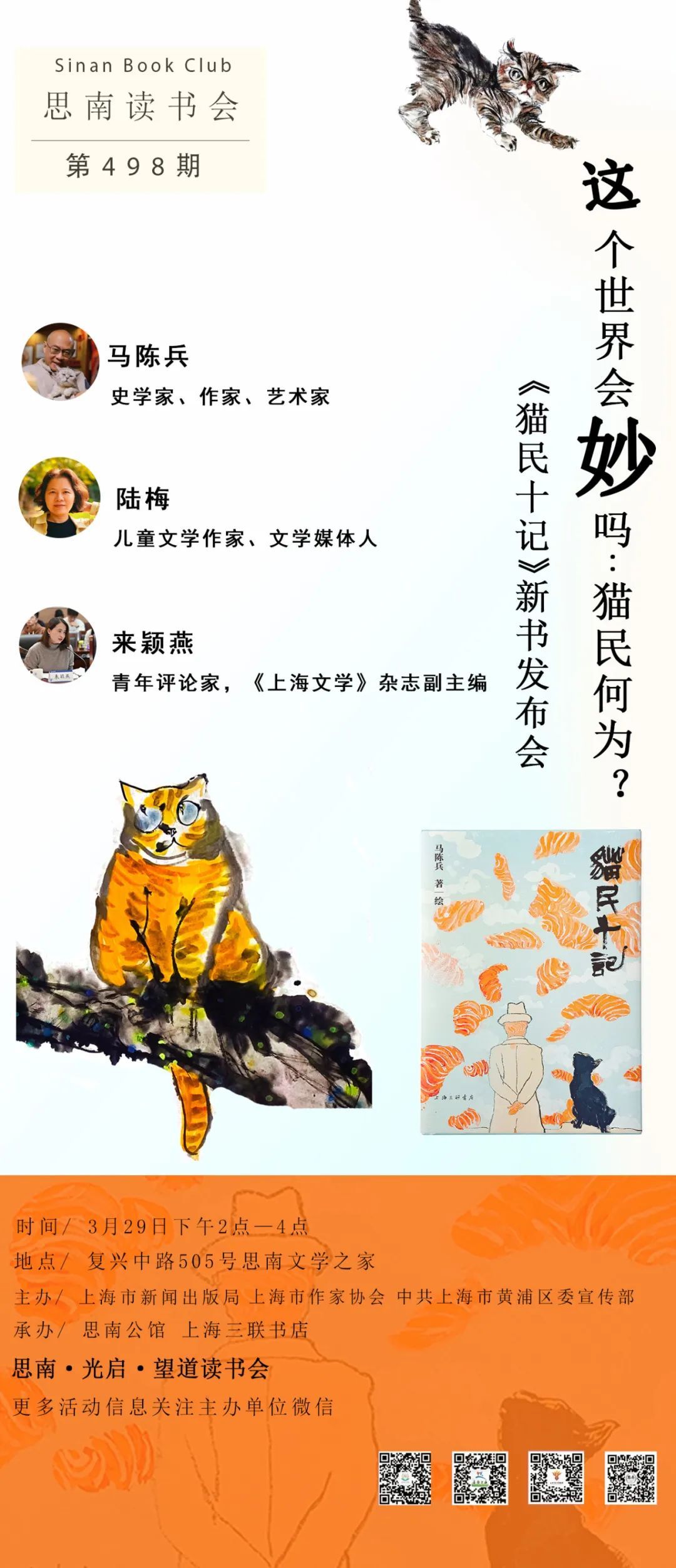 2025年3月29日下午两点,学者、作家、艺术家、《猫民十记》作者马陈兵与《文学报》总编辑陆梅、《上海文学》副主编来颖燕做客思南文学之家,与读者朋友一起探讨全民爱猫时代人与宠物、流浪动物的兴会交缠,解锁“猫民”新世界。