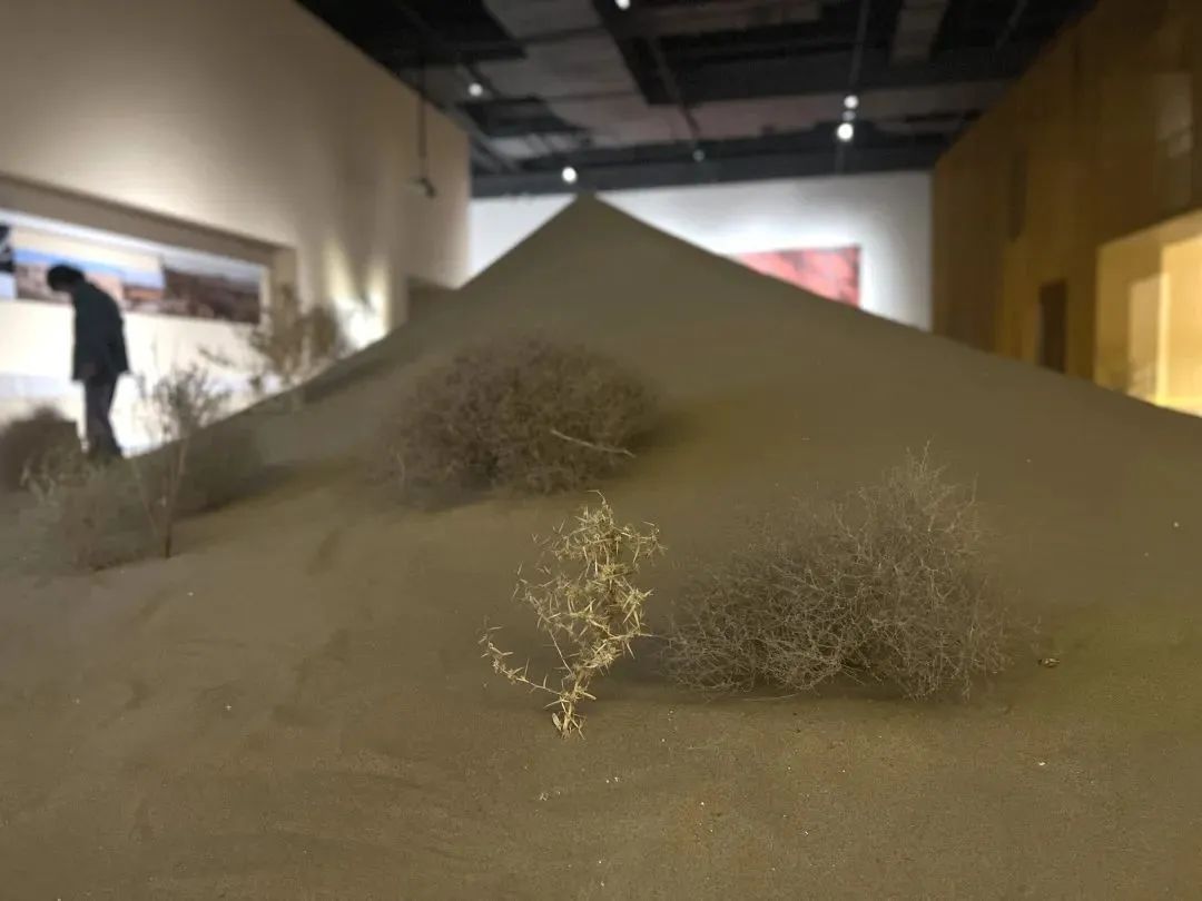 “我们把鸣沙山搬来了!”“境象敦煌”展览中,最引人注目的展品莫过于“自然”展区中的鸣沙香山。整座鸣沙香山坐落在展区中心区,艺术家通过在山形基座上覆盖敦煌鸣沙山的山沙,让参观者身临其境,仿佛真正步入了敦煌,感受鸣沙山上的一草一木。
