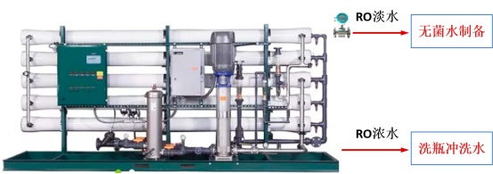 将RO水处理系统的浓水回收后用于脏瓶清洗的第一道冲洗水,同时达到节水和瓶子冲洗的目的。