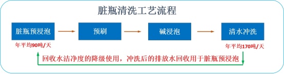 回收水洁净度的降级使用。将玻璃瓶冲洗后的水进行回收,作为第一道脏瓶的浸泡水,同时达到节水和脏瓶预浸泡的目的。