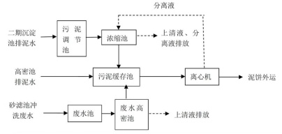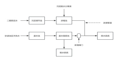 南市水厂一期、二期砂滤池反冲洗水经废水池调蓄后,通过废水高密池处理,上清液进行排放。二期排泥水经污泥调节池调蓄后,通过污泥浓缩池处理,与污泥脱水分离液混合进行排放。为达到节水减排的目的,厂内通过管道改接和增加阀门,将废水高密池上清液与新建浓缩池上清液分隔,实现砂滤池反冲洗水的回用。