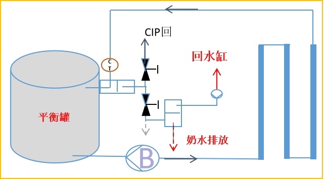 杀菌机排放管上安装二位三通座阀,将杀菌机CIP酸碱冲洗水和SIP用水进行回收过滤,作为CIP清洗的第一道预冲洗水使用。