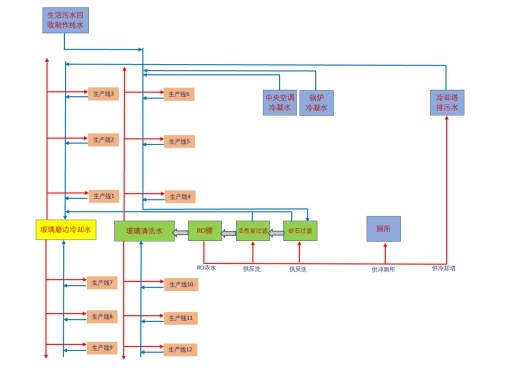 圣戈班始终坚持绿色发展理念,持续开展各项节水技改,用于提高工业水循环效率。已落实的节水措施包括玻璃清洗水循环利用、玻璃磨边冷却水循环利用、中央空调和锅炉冷凝水收集回用、冷却塔排污水串联利用、RO浓水回收利用、生活污水处理回用等8项节水技改项目,形成了完整的工业水循环利用链条。