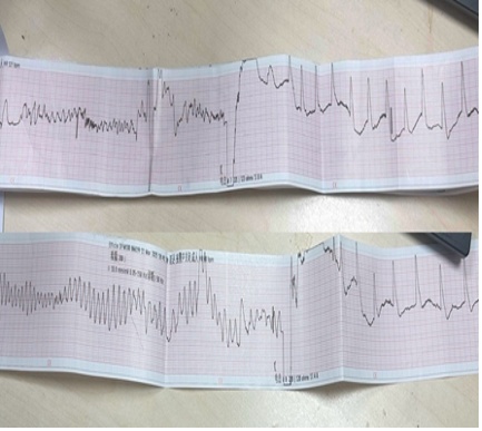 在心血管内科二线刘洋副主任医师的会诊下,急诊团队与患者家属沟通后决定立即进行冠状动脉造影,以尽快开通闭塞血管。约20分钟后,患者被紧急送往导管室。然而,途中意外发生,患者心电监护波形突然显示室颤心律,意识丧失!